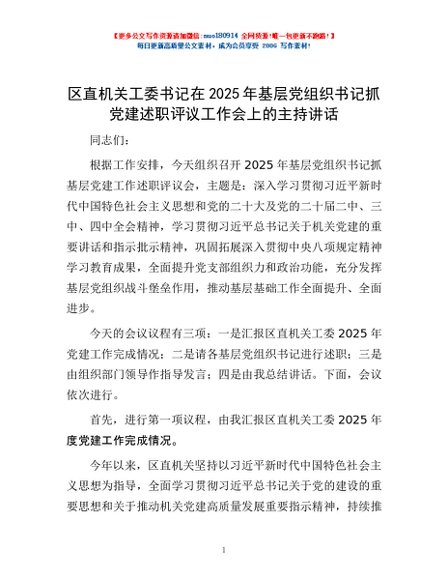 / 区直机关工委书记在2025年基层党组织书记抓党建述职评议工作会上的主持讲话