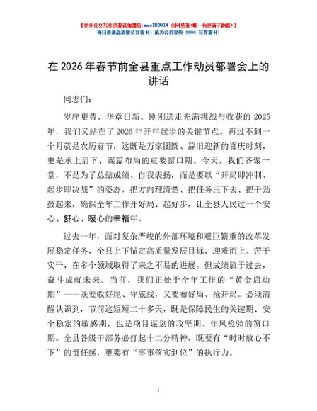 / 在2026年春节前全县重点工作动员部署会上的讲话