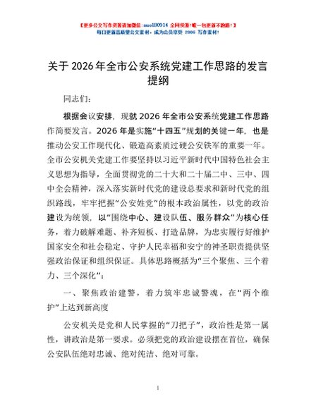 / 关于2026年全市公安系统党建工作思路的发言提纲