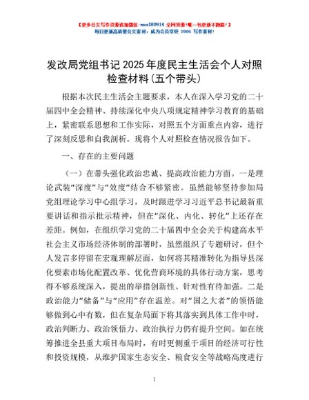 / 发改局党组书记2025年度民主生活会个人对照检查材料(五个带头)