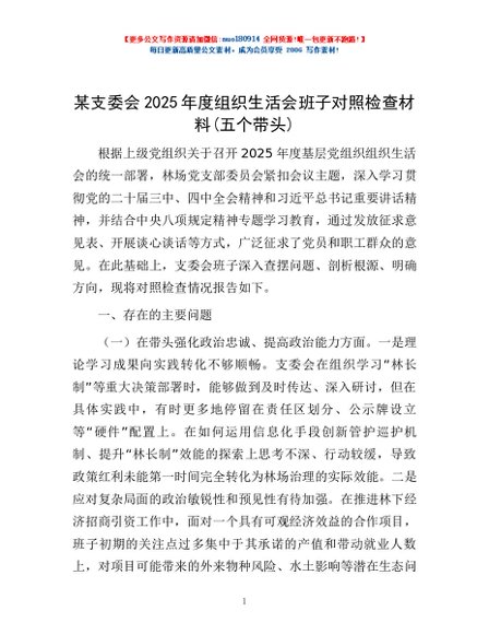 / 某支委会2025年度组织生活会班子对照检查材料(五个带头)
