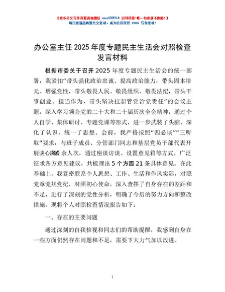 / 办公室主任2025年度专题民主生活会对照检查发言材料