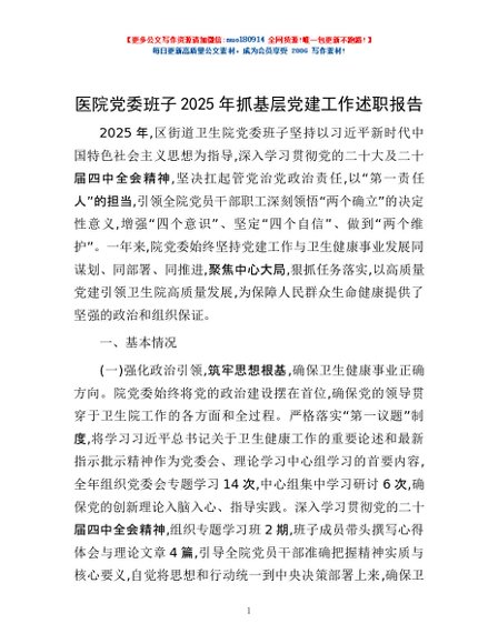 / 医院党委班子2025年抓基层党建工作述职报告
