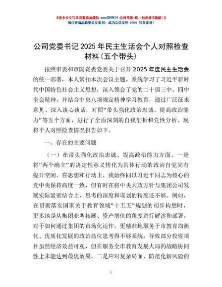 / 公司党委书记2025年民主生活会个人对照检查材料(五个带头)