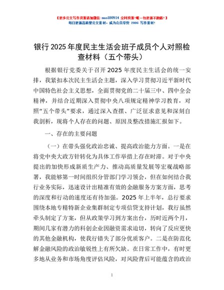 / 银行2025年度民主生活会班子成员个人对照检查材料(五个带头)