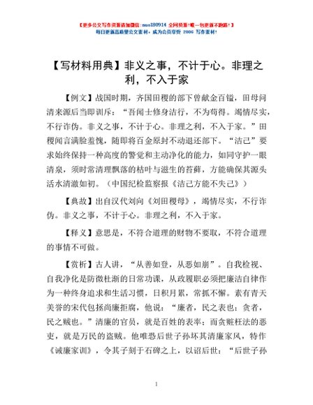 / 【写材料用典】非义之事,不计于心。非理之利,不入于家