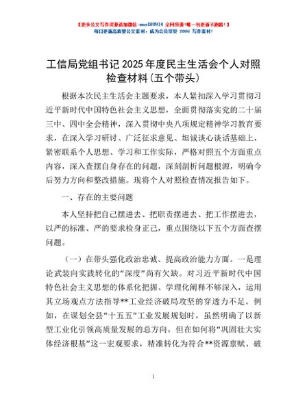 / 工信局党组书记2025年度民主生活会个人对照检查材料(五个带头)