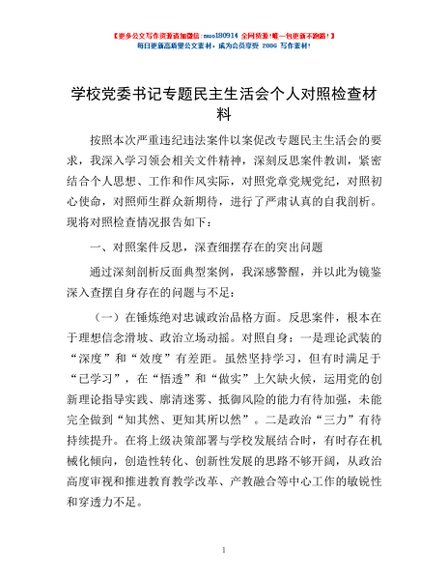 / 学校党委书记专题民主生活会个人对照检查材料
