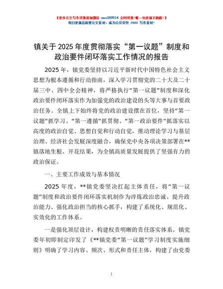 / 镇关于2025年度贯彻落实“第一议题”制度和政治要件闭环落实工作情况的报告