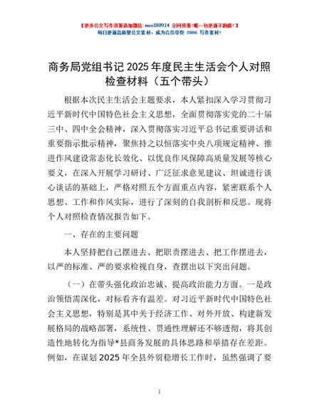 / 商务局党组书记2025年度民主生活会个人对照检查材料(五个带头)
