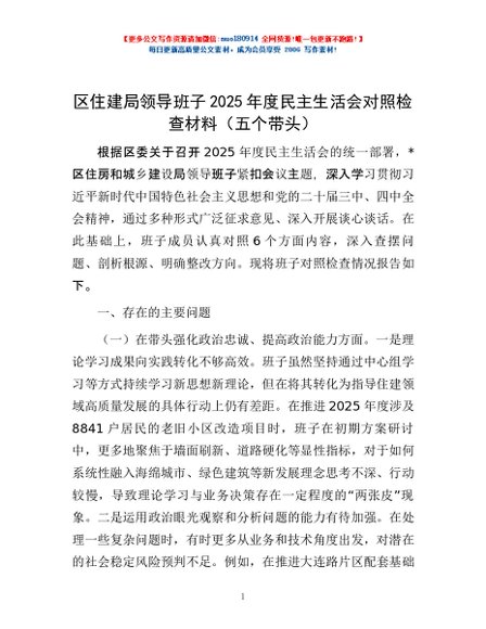 / 区住建局领导班子2025年度民主生活会对照检查材料(五个带头)