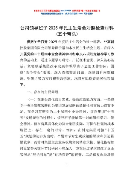 / 公司领导班子2025年民主生活会对照检查材料(五个带头)