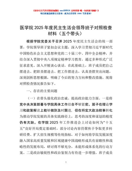 / 医学院2025年度民主生活会领导班子对照检查材料(五个带头)