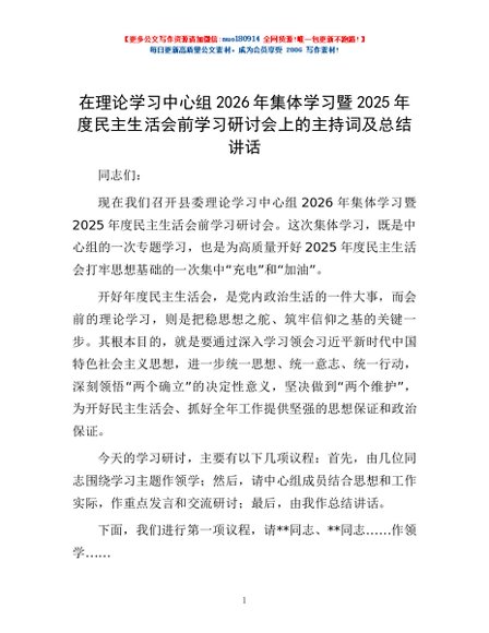 / 在理论学习中心组2026年集体学习暨2025年度民主生活会前学习研讨会上的主持词及总结讲话