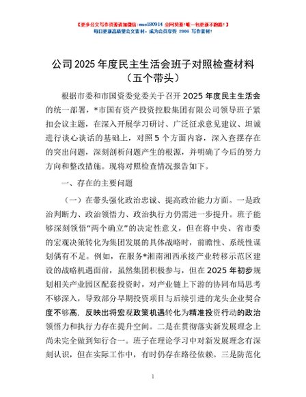 / 公司2025年度民主生活会班子对照检查材料(五个带头)