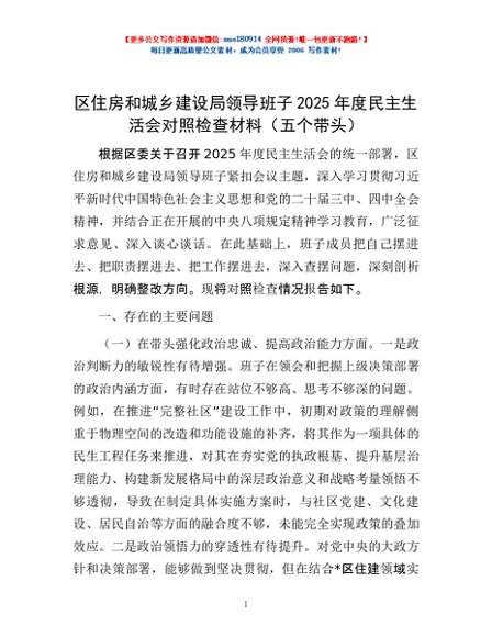 / 区住房和城乡建设局领导班子2025年度民主生活会对照检查材料(五个带头)