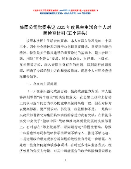 / 集团公司党委书记2025年度民主生活会个人对照检查材料(五个带头)