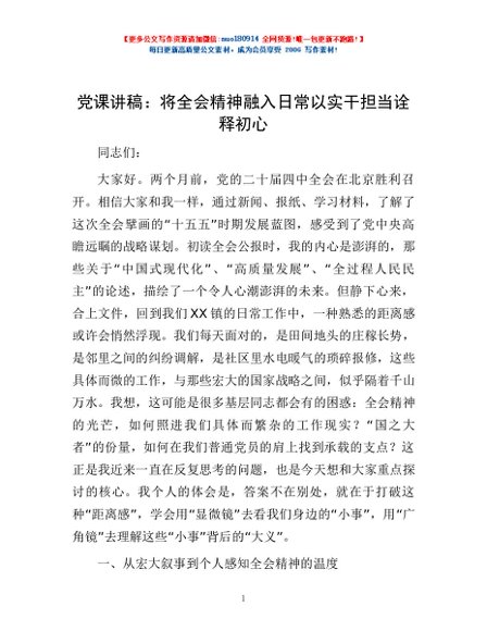 / 党课讲稿:将全会精神融入日常 以实干担当诠释初心