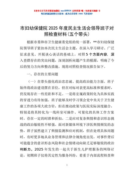 / 市妇幼保健院2025年度民主生活会领导班子对照检查材料(五个带头)