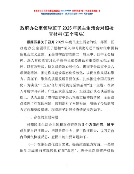 / 政府办公室领导班子2025年民主生活会对照检查材料(五个带头)