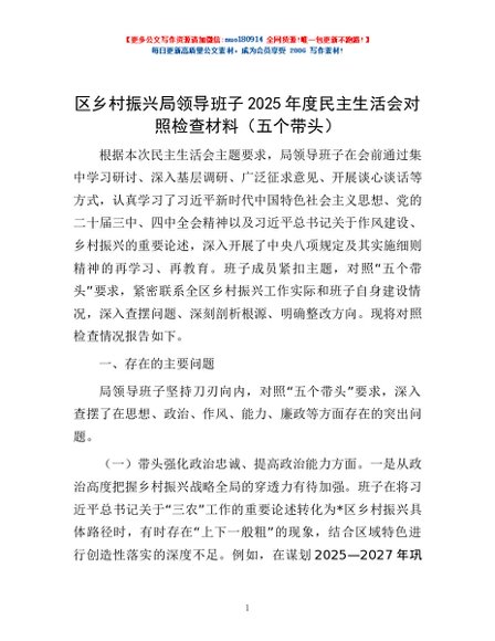 / 区乡村振兴局领导班子2025年度民主生活会对照检查材料(五个带头)