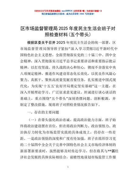/ 区市场监督管理局2025年度民主生活会班子对照检查材料(五个带头)
