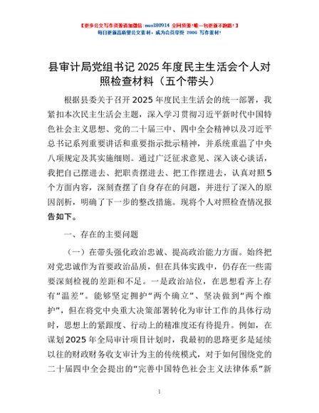 / 县审计局党组书记2025年度民主生活会个人对照检查材料(五个带头)