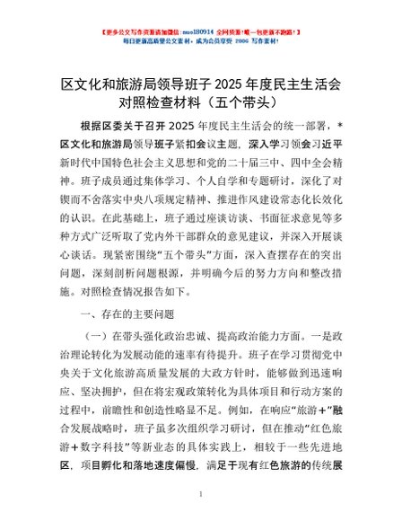 / 区文化和旅游局领导班子2025年度民主生活会对照检查材料(五个带头)