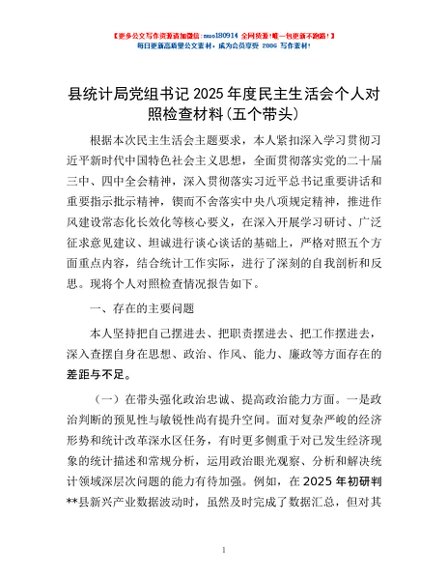 / 县统计局党组书记2025年度民主生活会个人对照检查材料(五个带头)