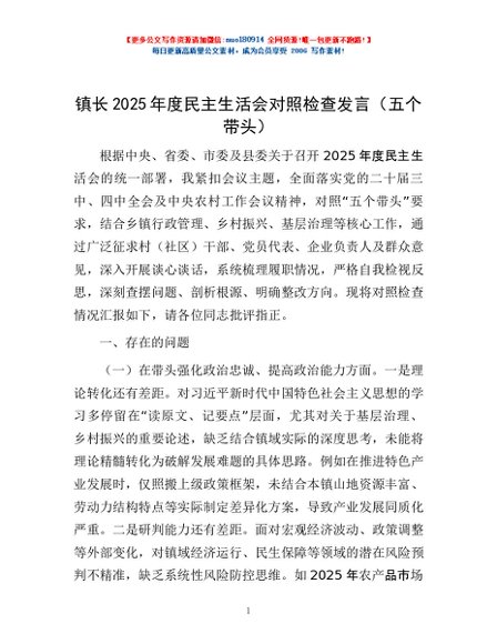 / 镇长2025年度民主生活会对照检查发言(五个带头)