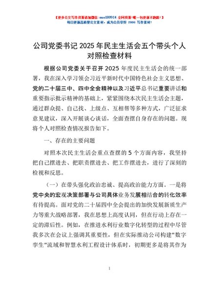 / 公司党委书记2025年民主生活会五个带头个人对照检查材料