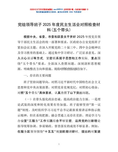 / 党组领导班子2025年度民主生活会对照检查材料(五个带头)