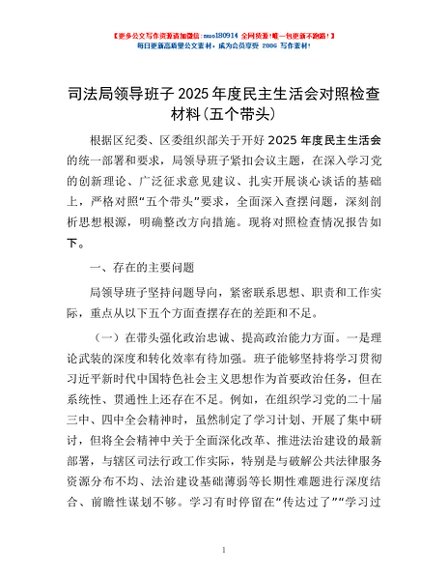/ 司法局领导班子2025年度民主生活会对照检查材料(五个带头)