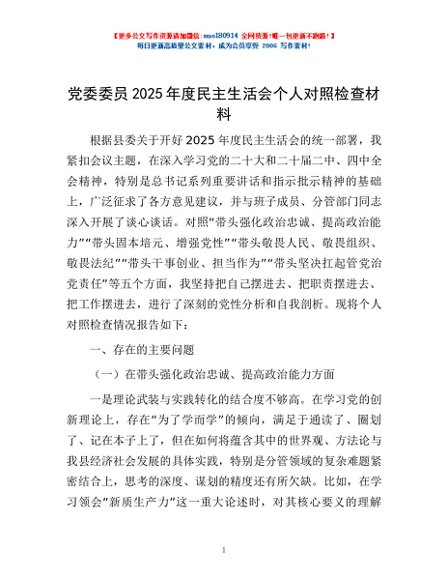 / 党委委员2025年度民主生活会个人对照检查材料
