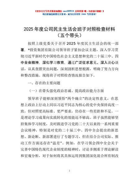 / 2025年度公司民主生活会班子对照检查材料(五个带头)