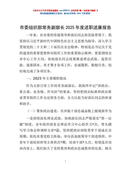 / 市委组织部常务副部长2025年度述职述廉报告