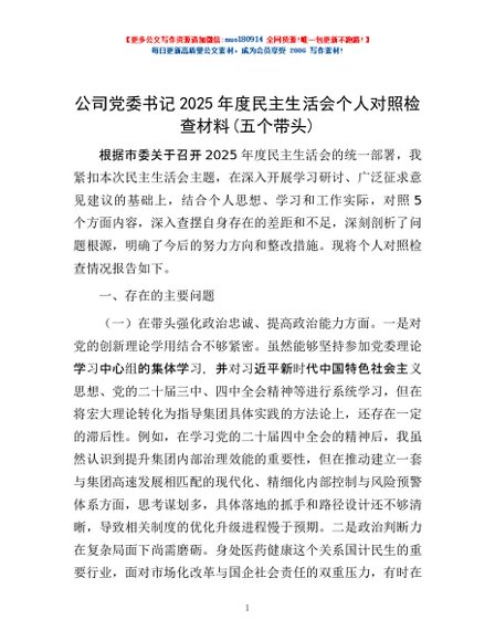/ 公司党委书记2025年度民主生活会个人对照检查材料(五个带头)