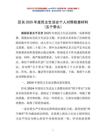 / 区长2025年度民主生活会个人对照检查材料(五个带头)
