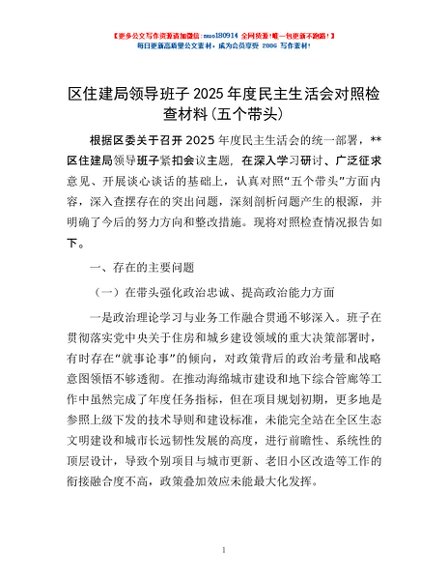 / 区住建局领导班子2025年度民主生活会对照检查材料(五个带头)