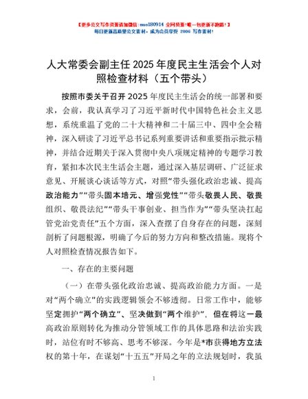 / 人大常委会副主任2025年度民主生活会个人对照检查材料(五个带头)