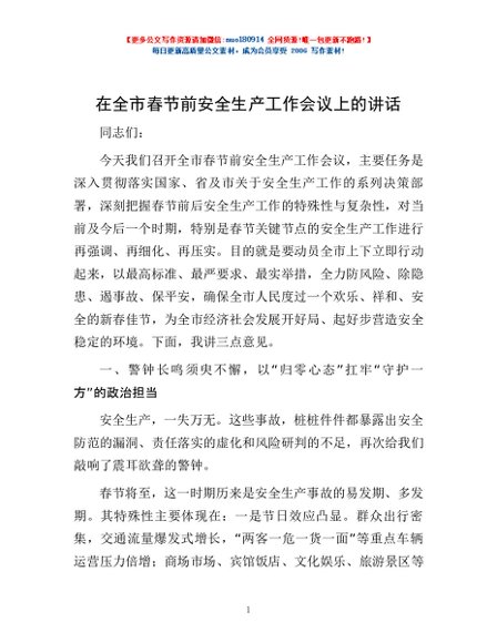 / 在全市春节前安全生产工作会议上的讲话