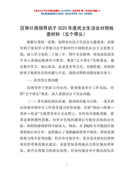/ 区审计局领导班子2025年度民主生活会对照检查材料(五个带头)