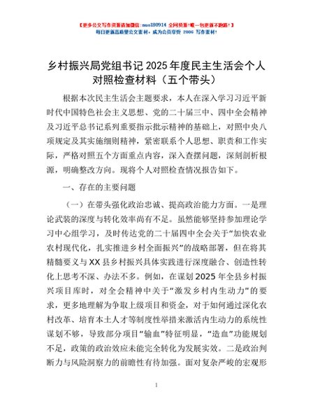 / 乡村振兴局党组书记2025年度民主生活会个人对照检查材料(五个带头)