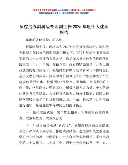 / 镇综治办副科级专职副主任2025年度个人述职报告