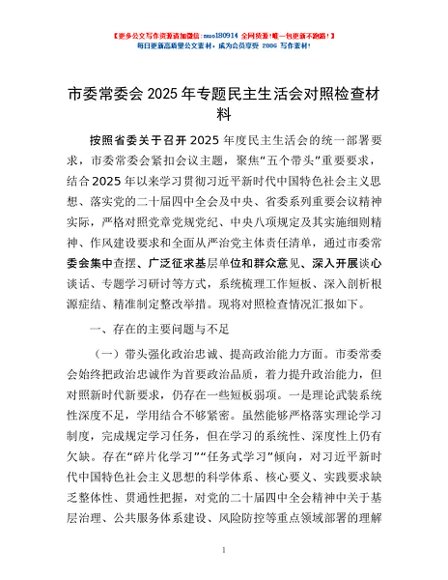 / 市委常委会2025年专题民主生活会对照检查材料