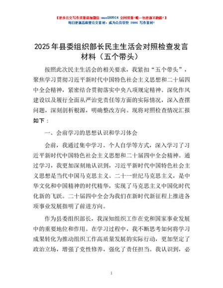 / 2025年县委组织部长民主生活会对照检查发言材料(五个带头)
