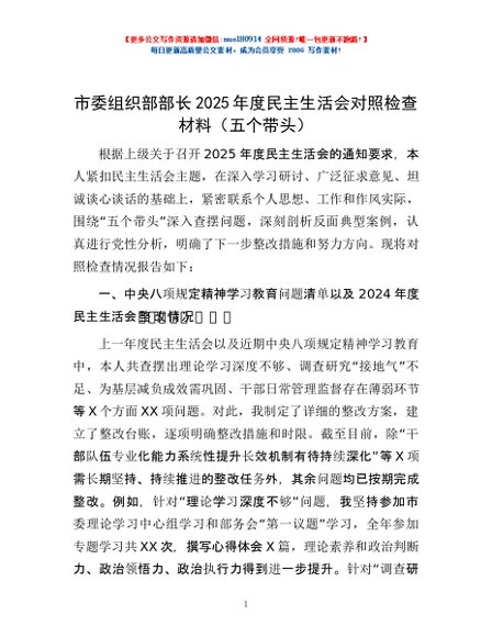 / 市委组织部部长2025年度民主生活会对照检查材料(五个带头)