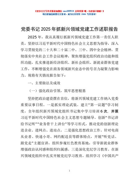 / 党委书记2025年抓新兴领域党建工作述职报告