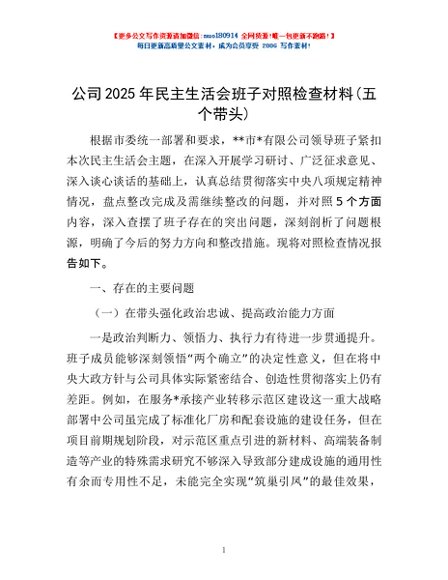 / 公司2025年民主生活会班子对照检查材料(五个带头)