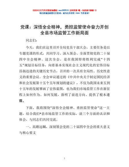 党课:深悟全会精神,勇担监管使命奋力开创全县市场监管工作新局面
